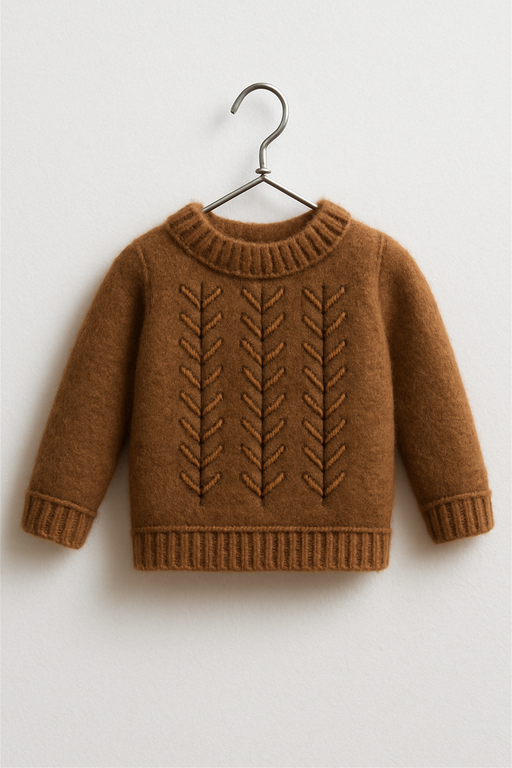 Crie a ilusão de um mini-suéter de tricô usando feltro ou flanela e bordando um padrão simples com linha de bordado. Pendure-o com um mini cabide feito de arame fino para um charme extra.
