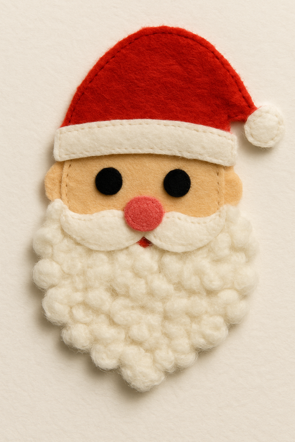 Um rosto simples de Papai Noel em feltro, mas com a barba feita de bolinhas de algodão ou lã desfiada. Essa textura fofa e realista dá um toque de aconchego ao clássico personagem natalino.