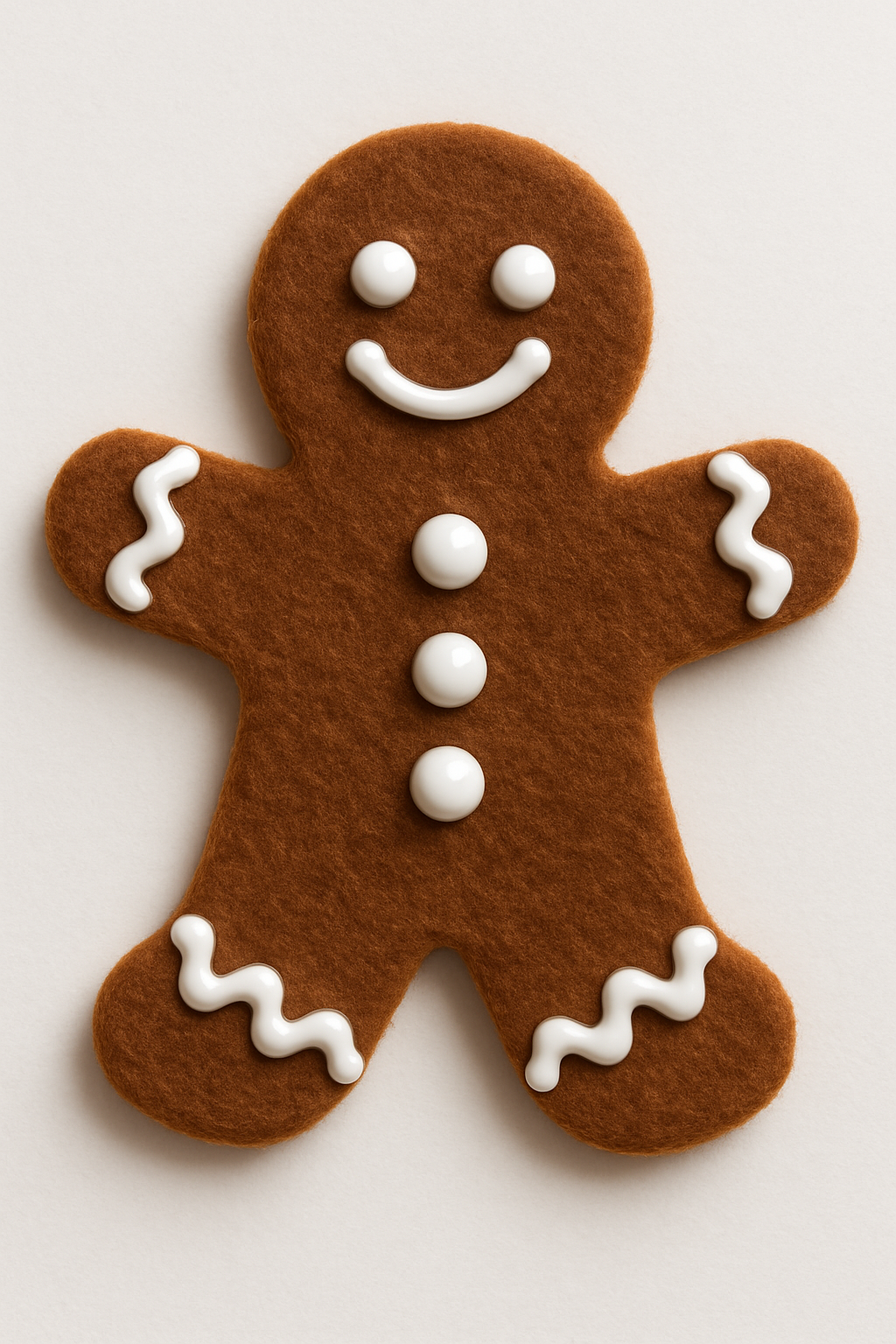 O tradicional boneco de gengibre, feito de feltro marrom. O segredo está no "glacê" e nos detalhes, feitos com tinta relevo branca que seca com volume e brilho, imitando a textura de um biscoito de verdade.
