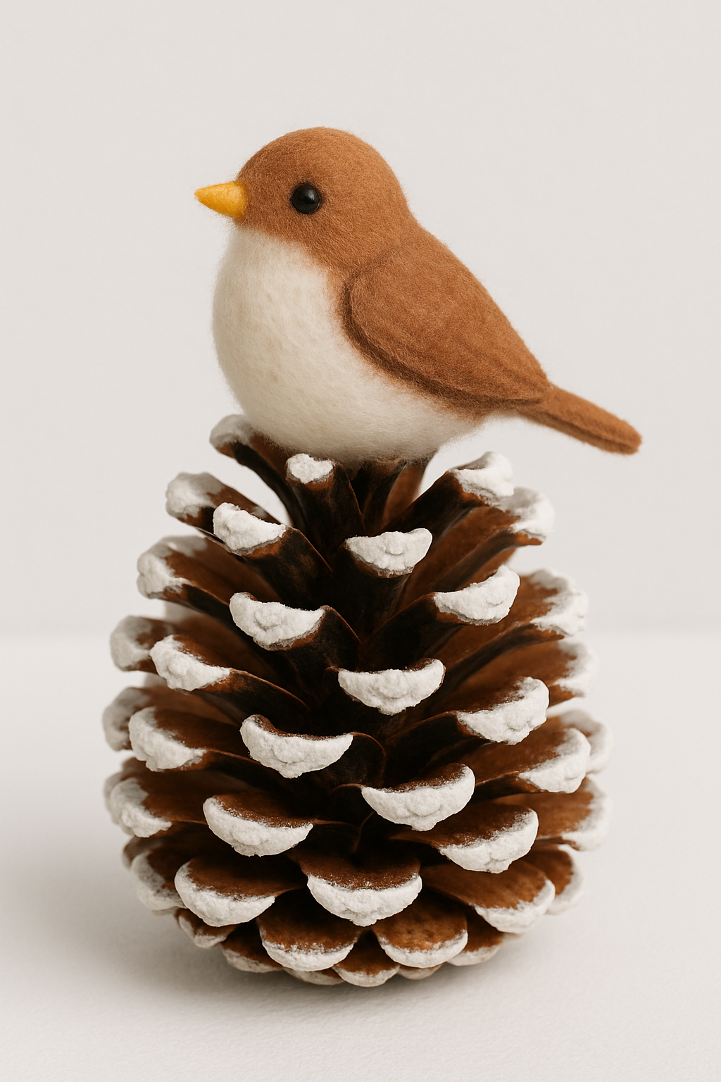 Pinte as pontas da pinha de branco para criar um efeito de neve. Cole um pequeno pássaro de feltro ou um pompom no topo, como se ele estivesse pousado. É uma peça delicada que traz a floresta para dentro de casa.
