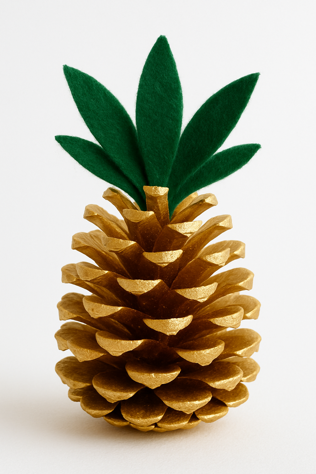Pinte a pinha inteira de dourado ou bronze. Cole folhas verdes de feltro ou papel-cartão no topo para simular a coroa de um abacaxi. Um toque tropical e luxuoso!