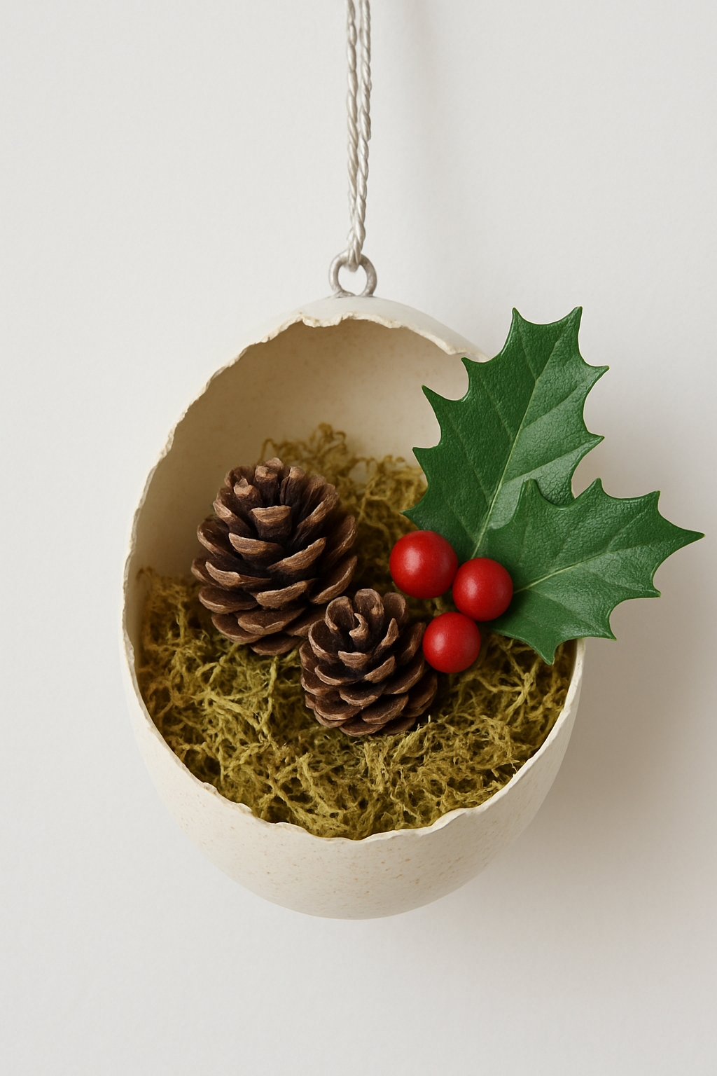 Use metade de uma casca de ovo limpa como base. Cole musgo seco, mini-pinhas e um pequeno raminho de azevinho (falso) dentro, criando um mini-cenário de inverno.