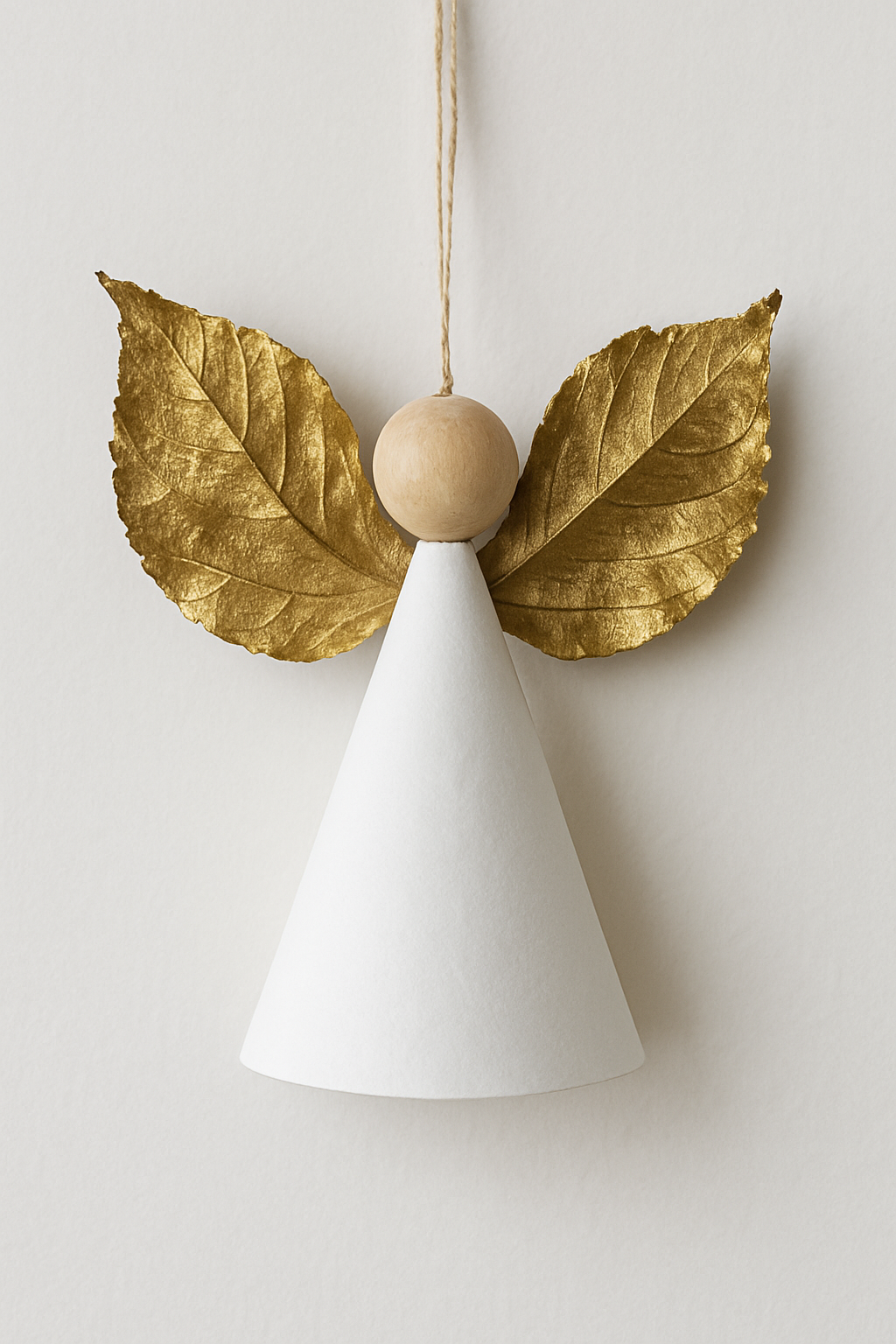 Uma folha seca e larga (como de plátano) é pintada de dourado para as asas. A cabeça é uma bolinha de madeira e o corpo um pequeno cone de papel. Um anjo etéreo e natural.