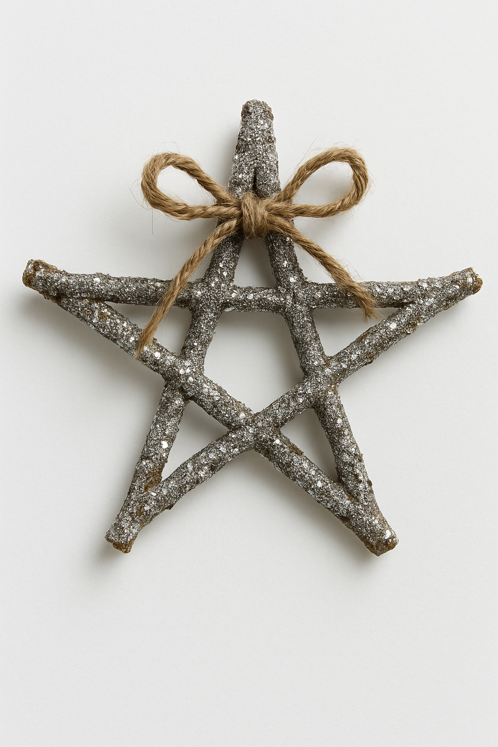 Cinco pequenos gravetos (ou palitos de picolé) são colados em formato de estrela. Decore com glitter prateado e um laço de juta para um visual rústico-chique.