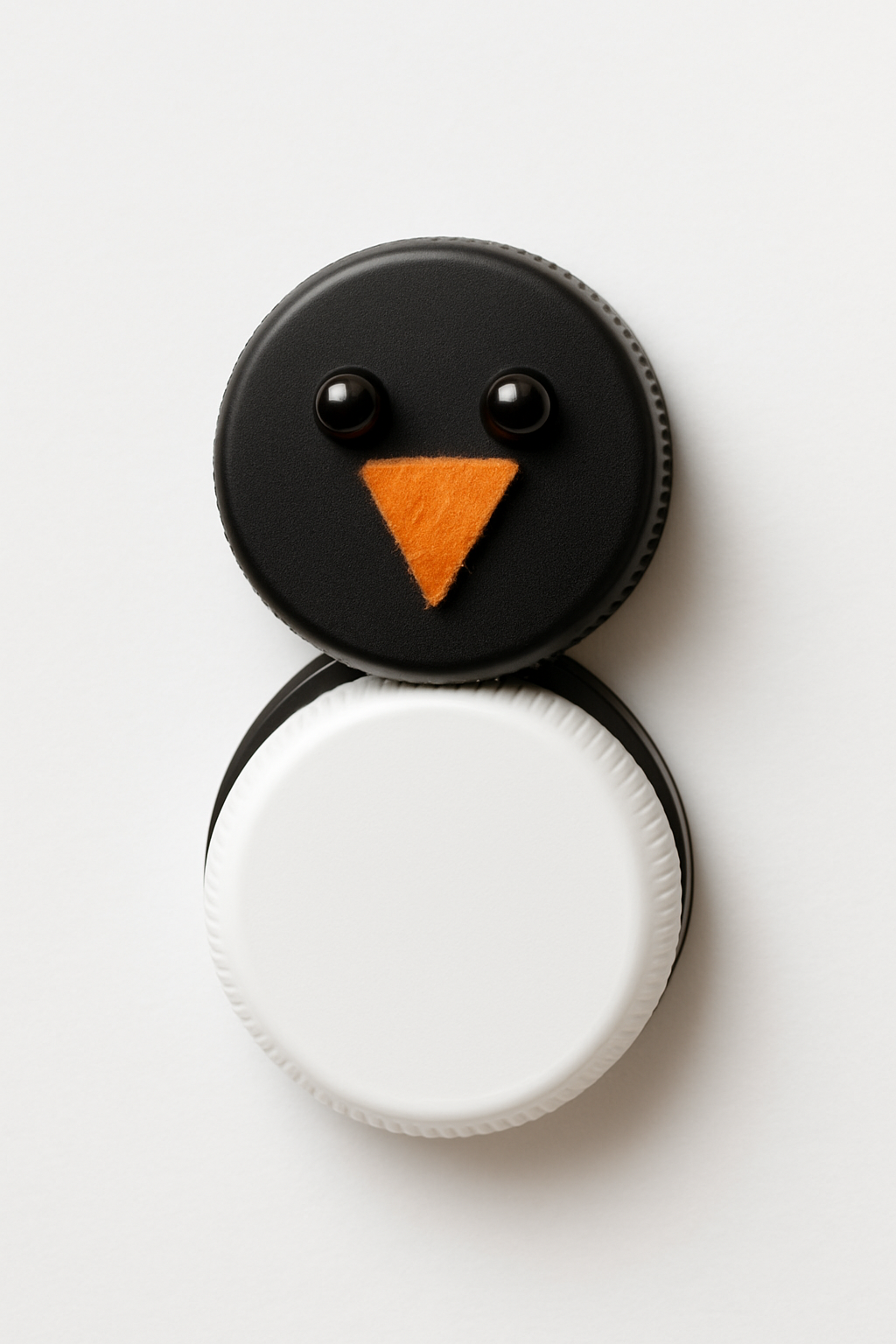 Duas tampinhas de garrafa PET (uma preta e uma branca) coladas juntas formam o corpo. Olhos de miçanga e um bico de feltro laranja completam o pinguim.