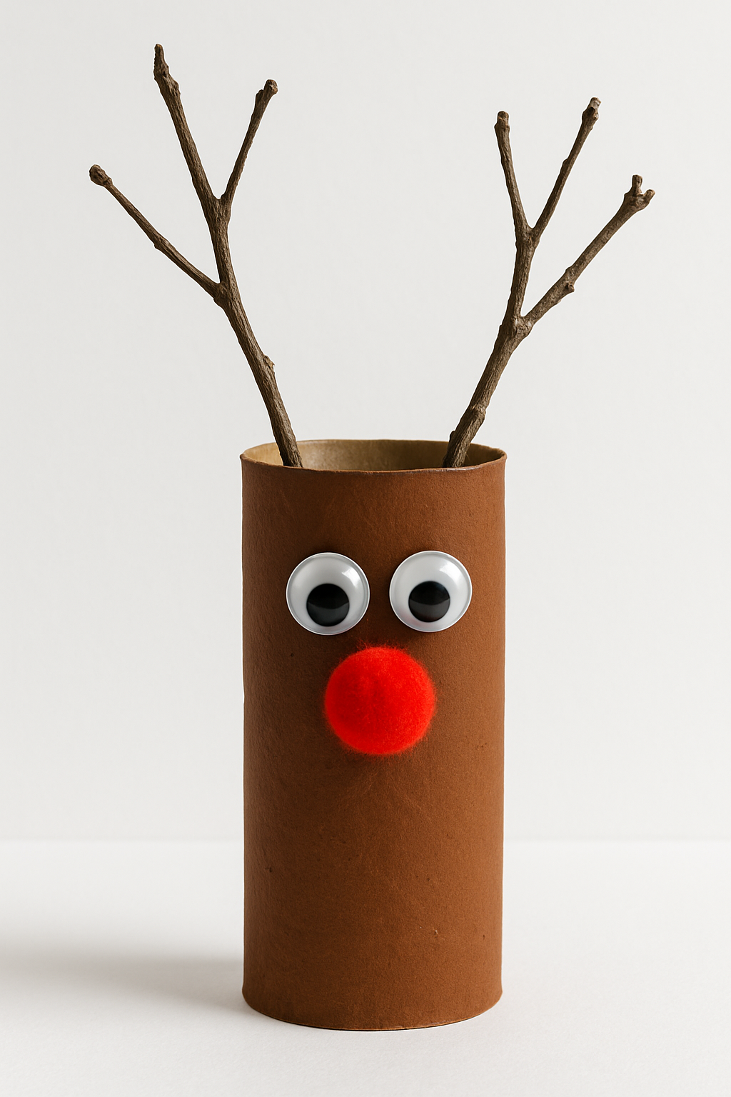 O rolo de papel higiênico é pintado de marrom. Chifres de arame ou galhos finos são colados no topo. Olhos móveis e um pompom vermelho para o nariz dão vida à rena.