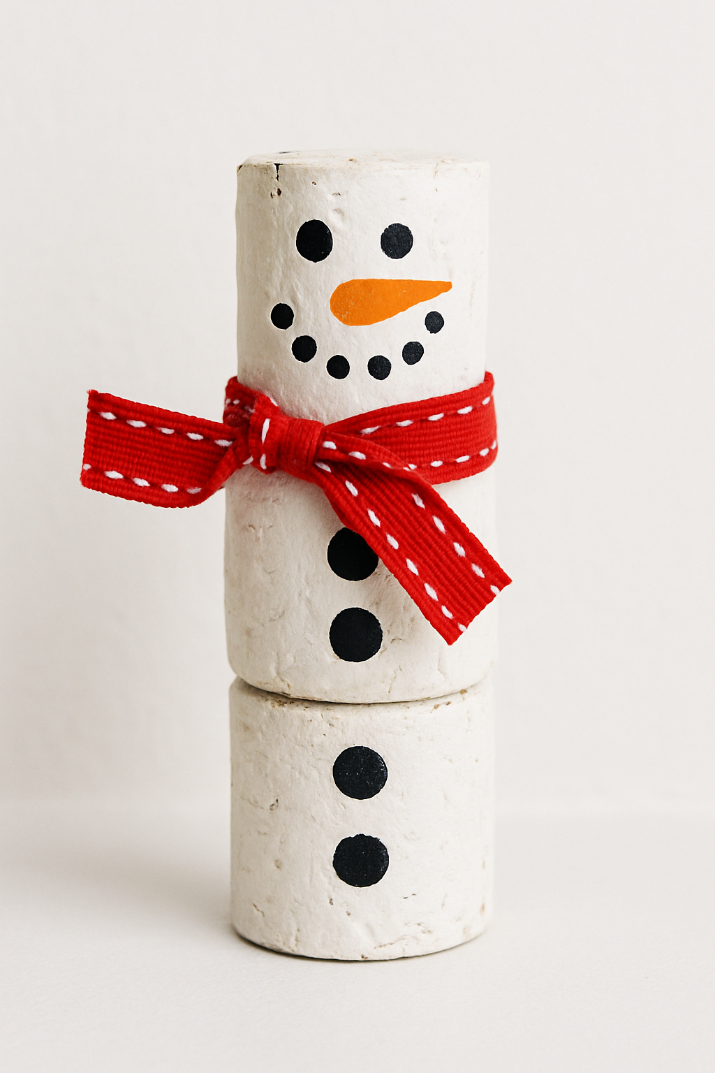 Três rolhas de vinho pintadas de branco e empilhadas formam o boneco. Decore com um mini-cachecol de fita e botões pretos pintados.