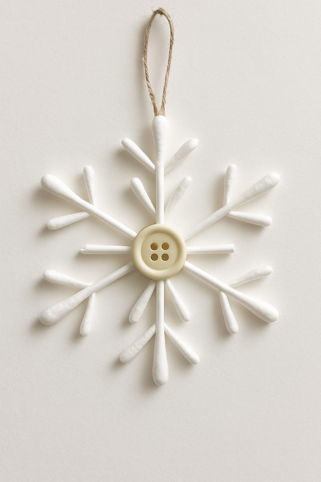 Cotonetes são cortados e colados em um padrão de floco de neve. O centro pode ser decorado com um botão ou miçanga. Uma ideia simples e surpreendente!