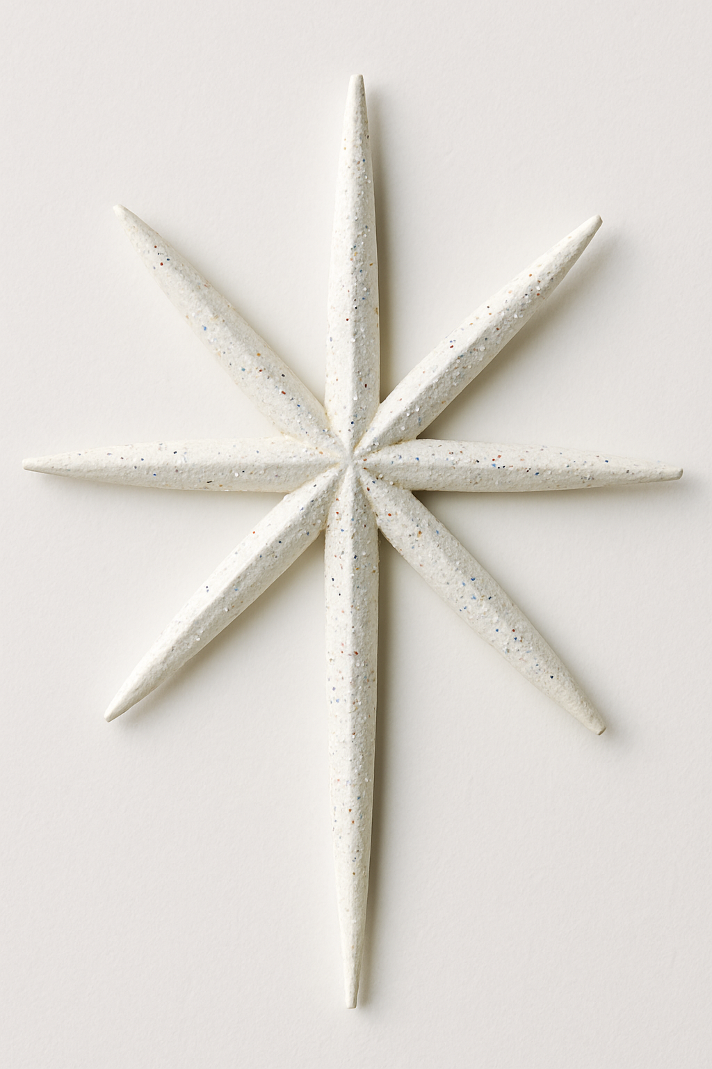 Palitos de churrasco são cortados e colados em formato de estrela de 8 pontas. Pintados de branco e polvilhados com glitter, ficam elegantes e modernos.