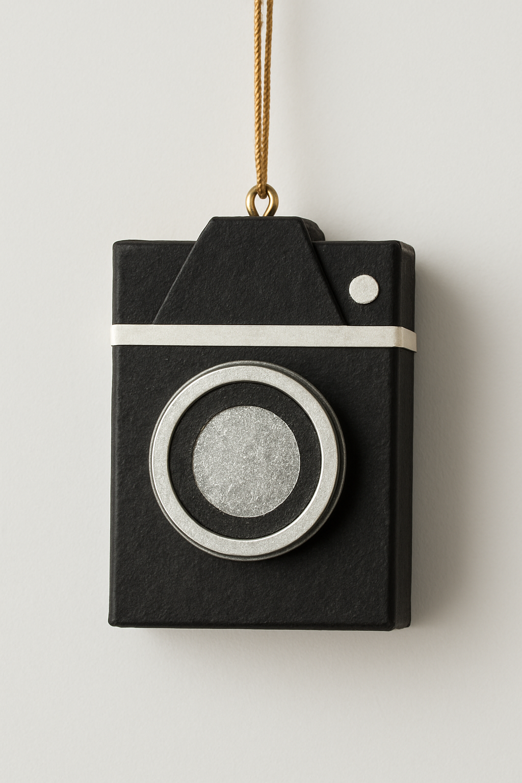 Uma caixinha de fósforo vazia é forrada com papel preto. Um círculo de papelão prateado simula a lente, criando uma mini-câmera retrô charmosa.