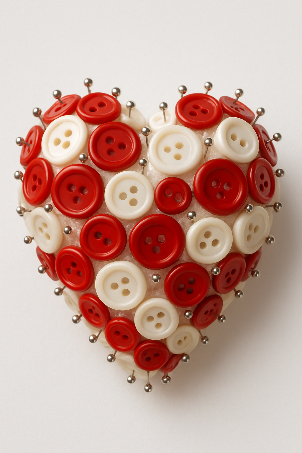 Um coração de isopor é coberto com botões vermelhos e brancos, fixados com alfinetes de cabeça colorida. Um enfeite romântico e cheio de textura.