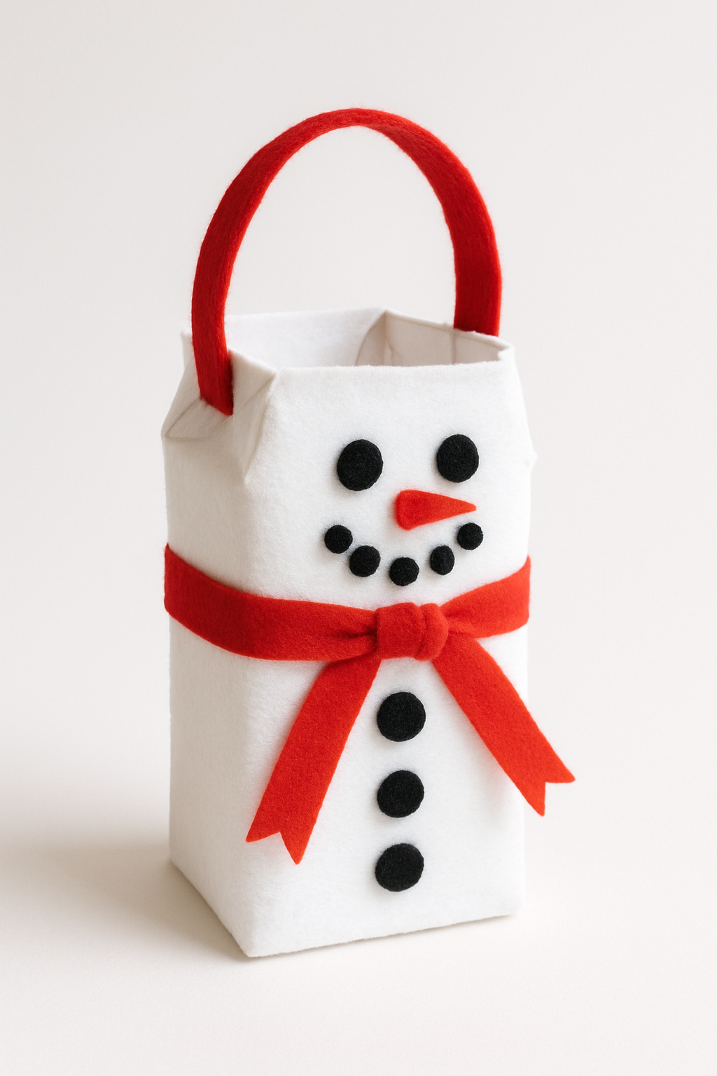 DIY: Cubra a caixa com feltro ou papel branco. Use botões pretos para os olhos e boca, e um pequeno cachecol de fita vermelha. O topo da caixa é cortado para servir como abertura para as guloseimas.