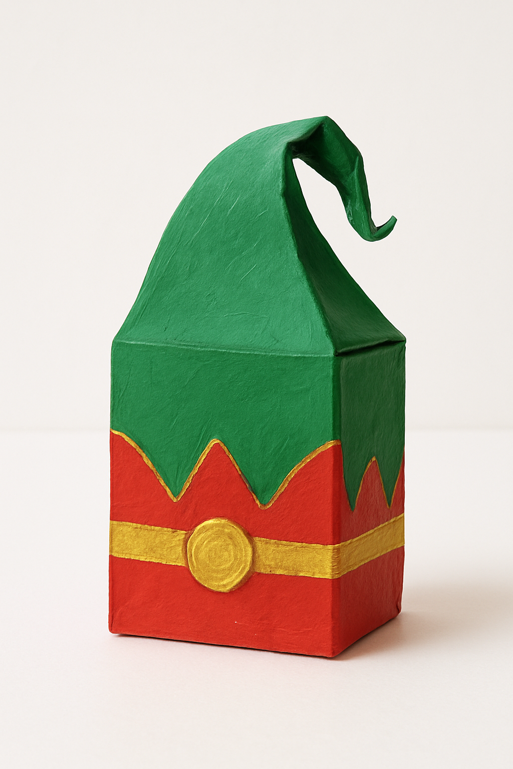 DIY: Corte a caixa em um formato que lembre um chapéu de duende (ponta dobrada). Pinte de verde e vermelho, com detalhes em dourado.