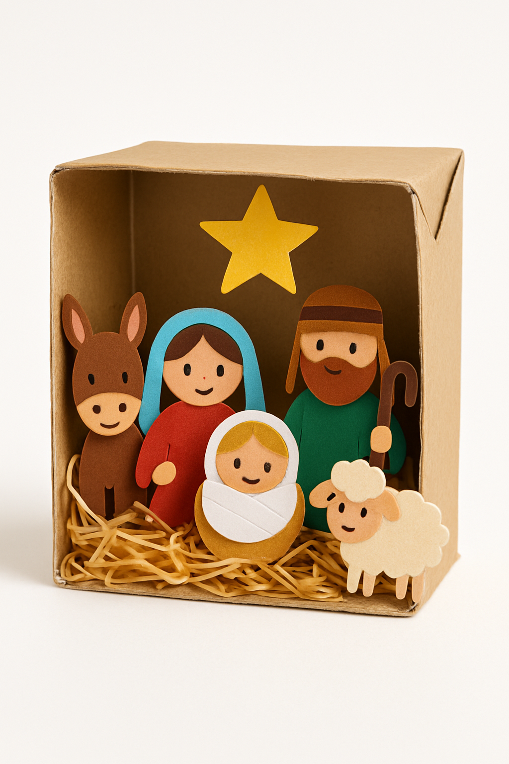 DIY: A caixa de leite é cortada ao meio no sentido horizontal, e a parte superior é usada como base. Decore o interior com palha e pequenas figuras de papel ou feltro representando o presépio.