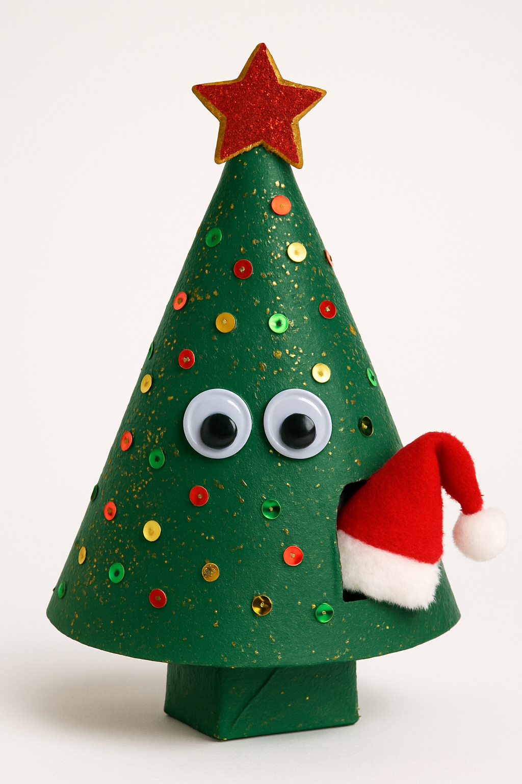 DIY: Corte a caixa em formato de cone e pinte de verde escuro. Decore com glitter e lantejoulas. A base do cone é aberta para esconder a surpresa.