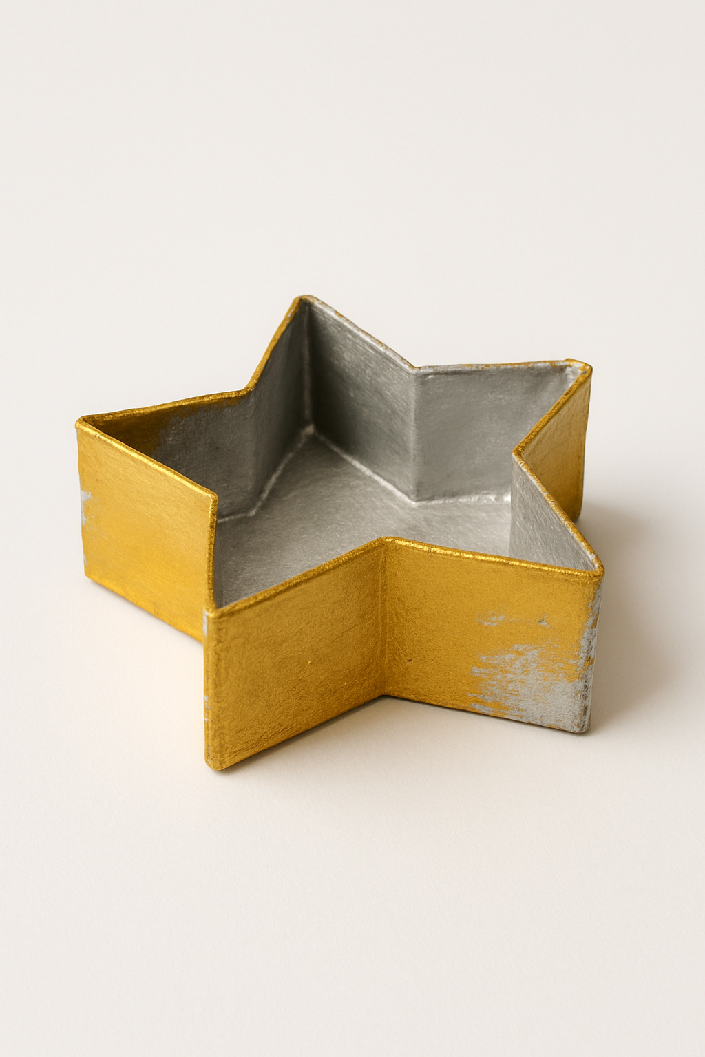 DIY: Desmonte a caixa e use o material para cortar duas estrelas grandes. Cole-as com uma tira lateral para criar uma caixa baixa em formato de estrela. Pinte de dourado ou prateado.