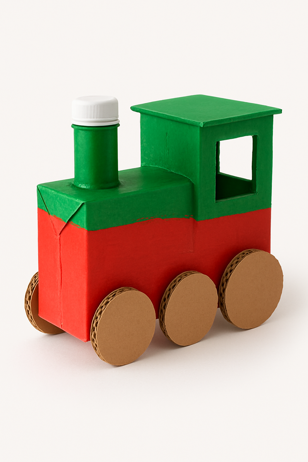 DIY: Use a caixa de leite como o vagão principal do trem. Pinte de cores vibrantes (vermelho e verde) e adicione rodas de papelão.