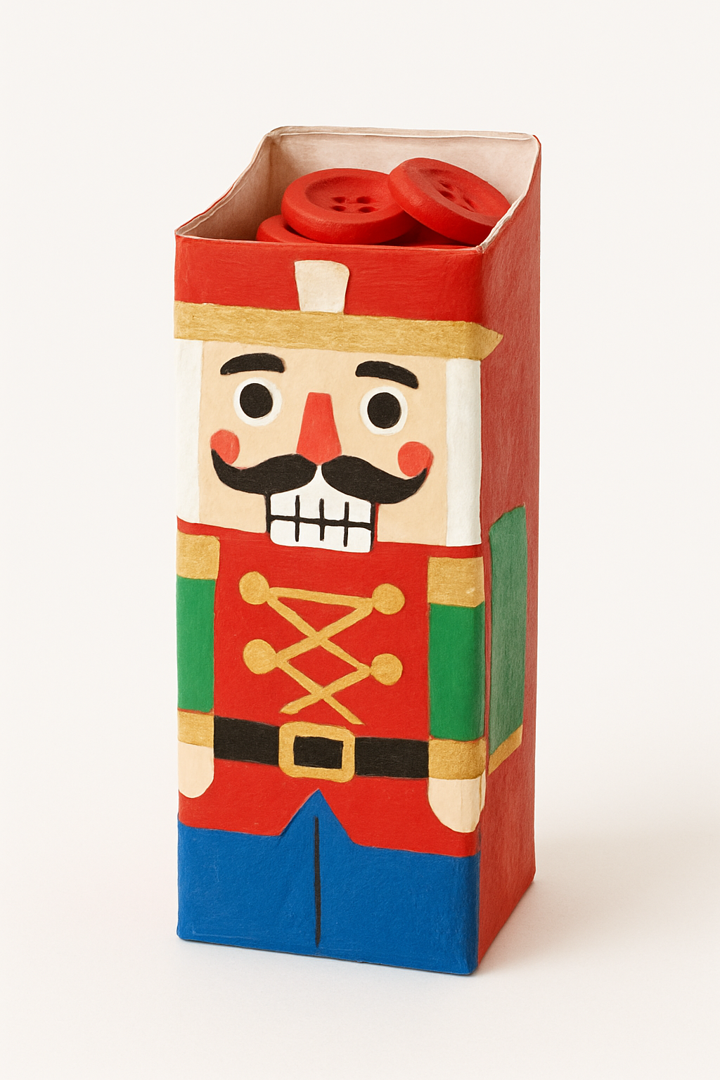 DIY: Use a caixa de leite na vertical. Pinte-a para simular o uniforme do Quebra-Nozes (vermelho, azul e dourado). O topo da caixa é a abertura.