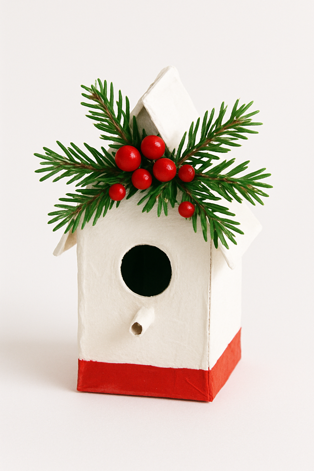 DIY: Corte a caixa para criar o formato de uma casa de passarinho, com um telhado triangular e uma pequena abertura frontal. Pinte de branco e decore com galhos de pinheiro e frutinhas vermelhas (artificiais).